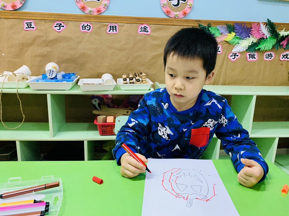 开学第一天,小朋友们回归幼儿园生活,上课时间小朋友们认真的做着,今天的南瓜是锻炼小朋友们的专注力,通过动手和眼睛观察使自己静下心来。每个人都在认真的连线。